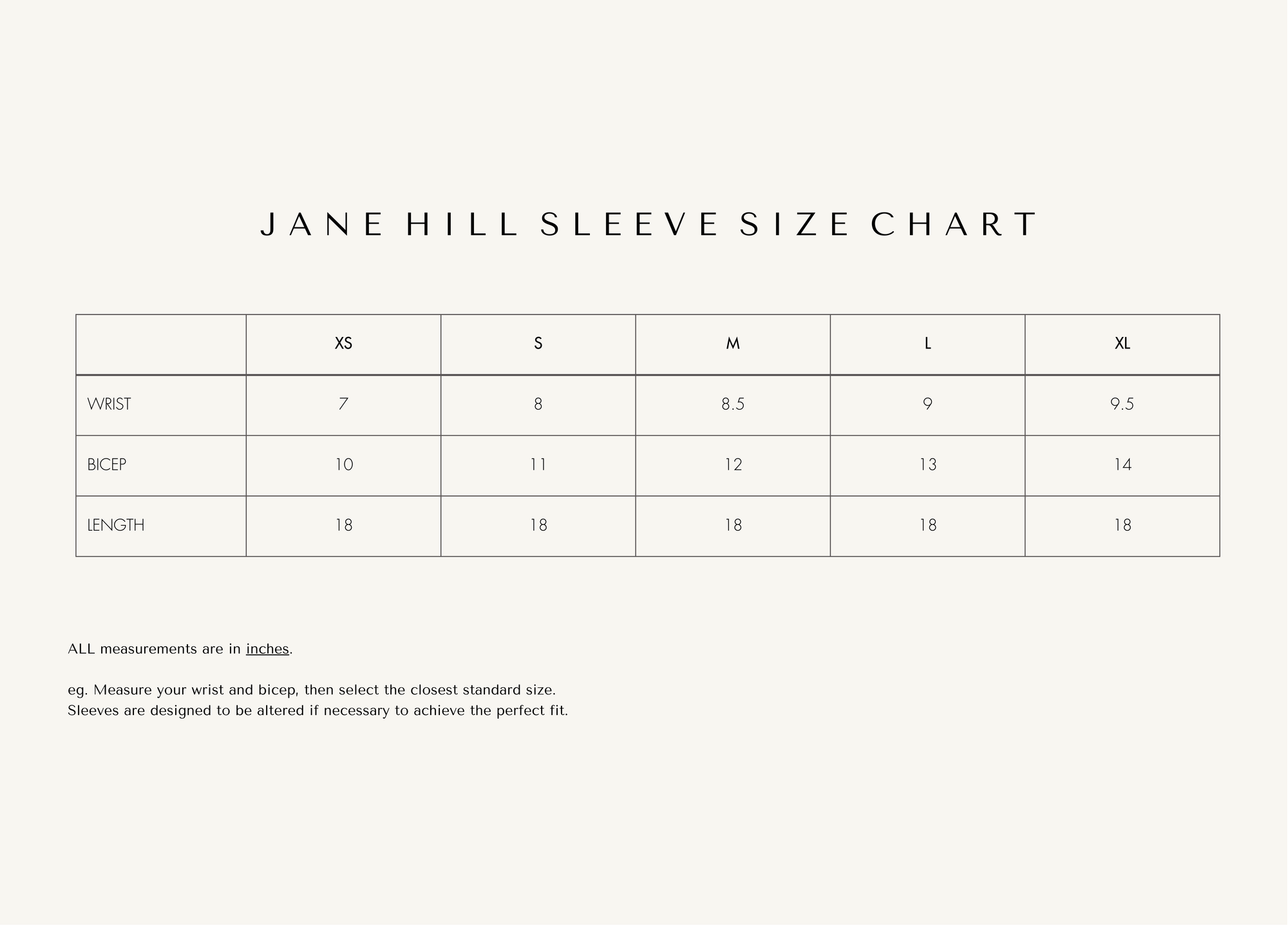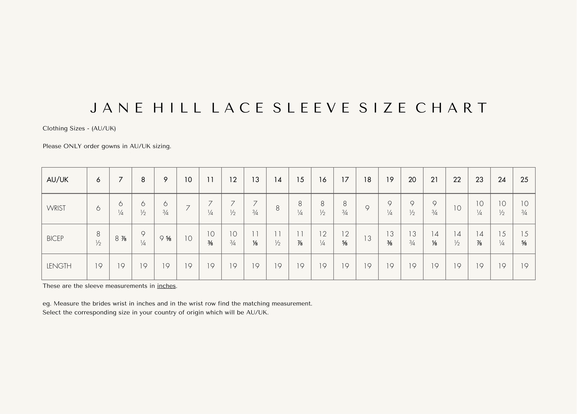 SLEEVE SIZE CHART - APPLIES TO PLAIN AND PEARL TULLE SLEEVES