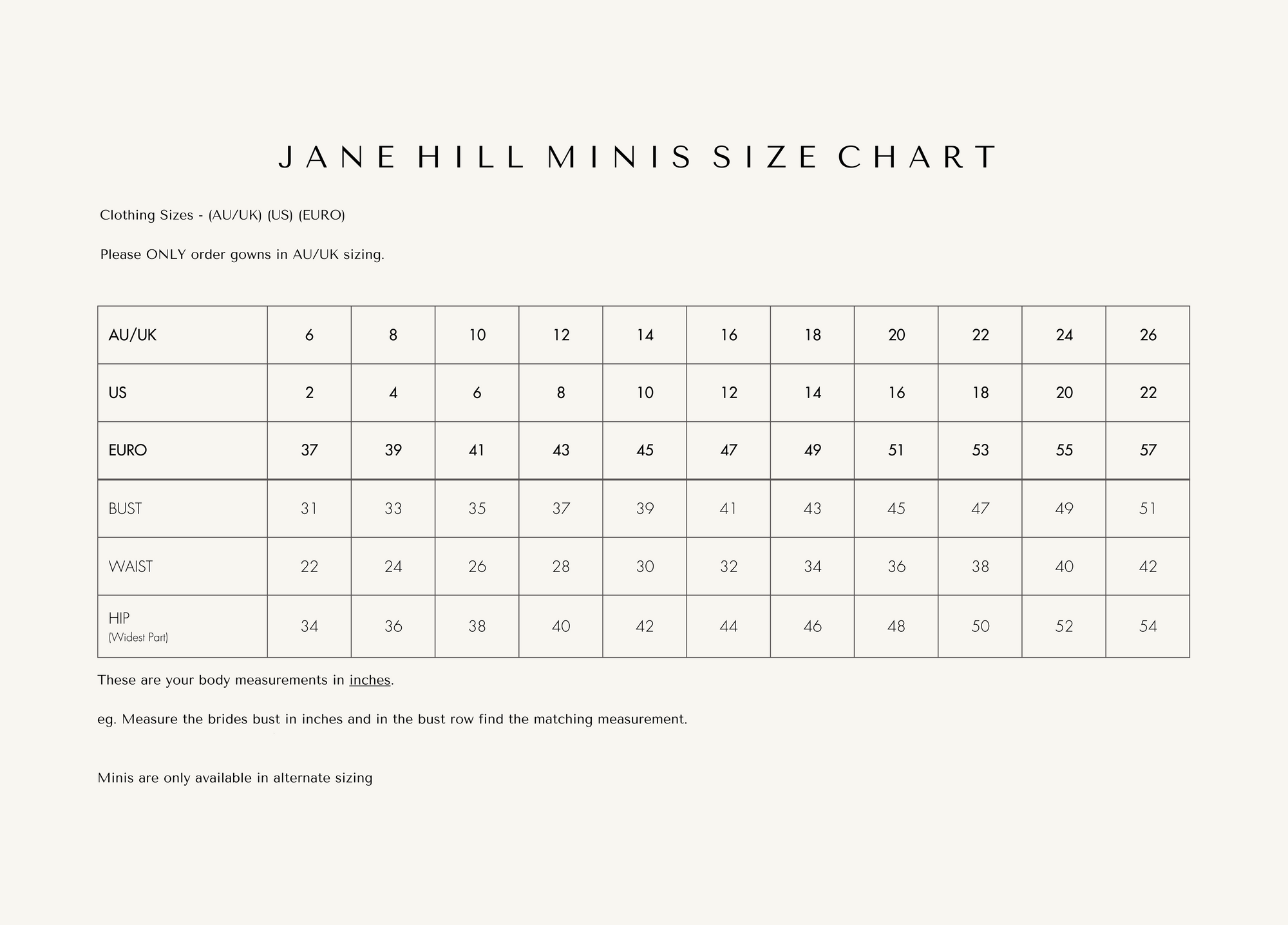 MINI GOWN SIZE CHART - HALF SIZES ONLY