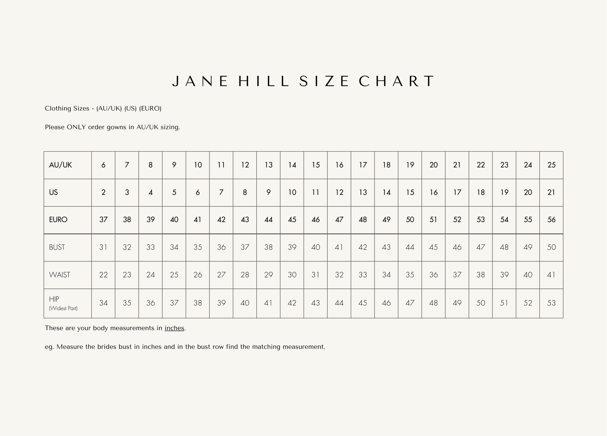 Please note that our bridal size chart differs from standard streetwear sizing, so the size you order may not match the size you typically wear in everyday clothing. If you’re unsure about sizing, we recommend speaking with your stylist, who will guide you through the process and help determine the most suitable size.