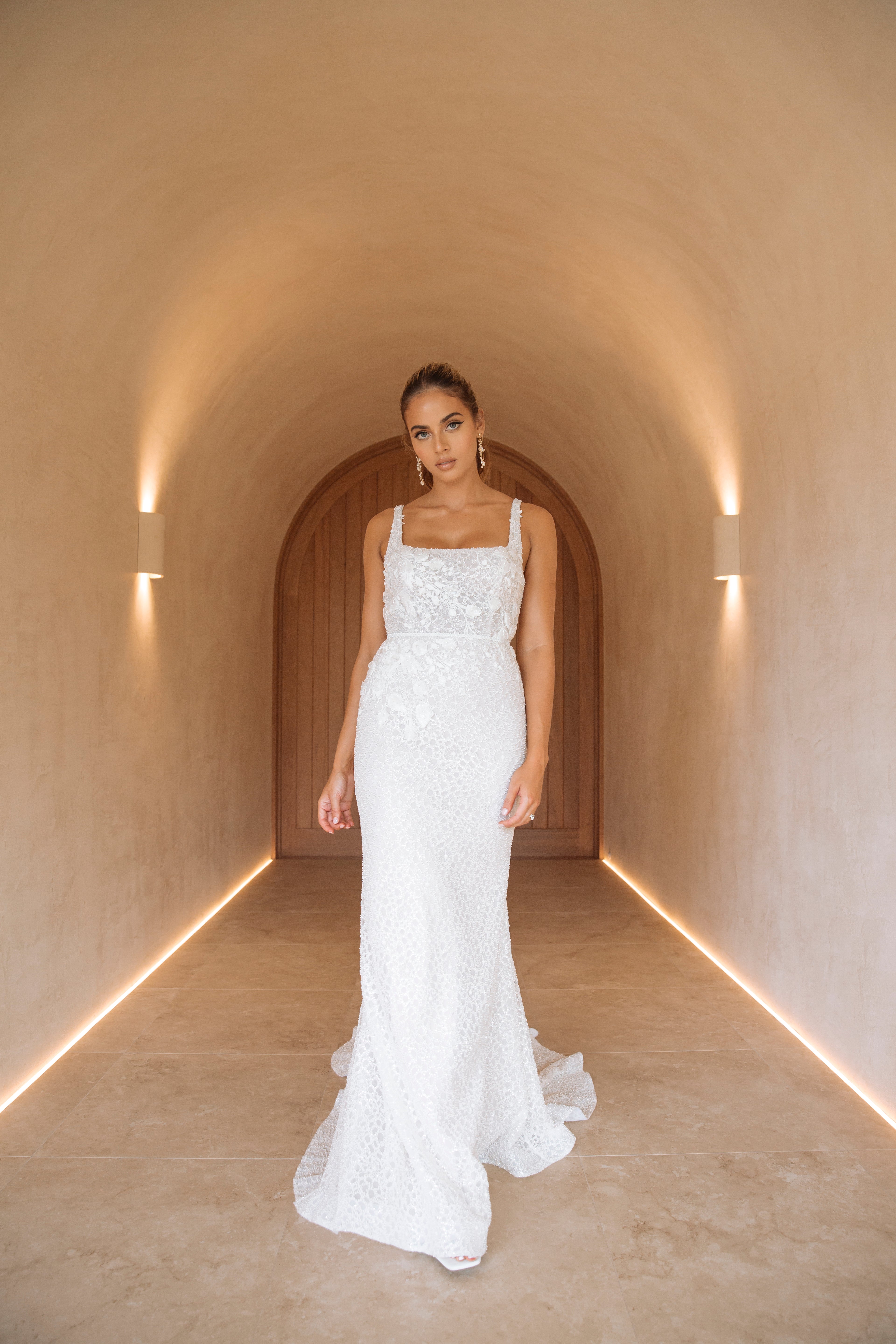 Our Aspen gown hugs the body with a fitted mermaid skirt and features a signature square neckline, flawless fit, and intricate beading.