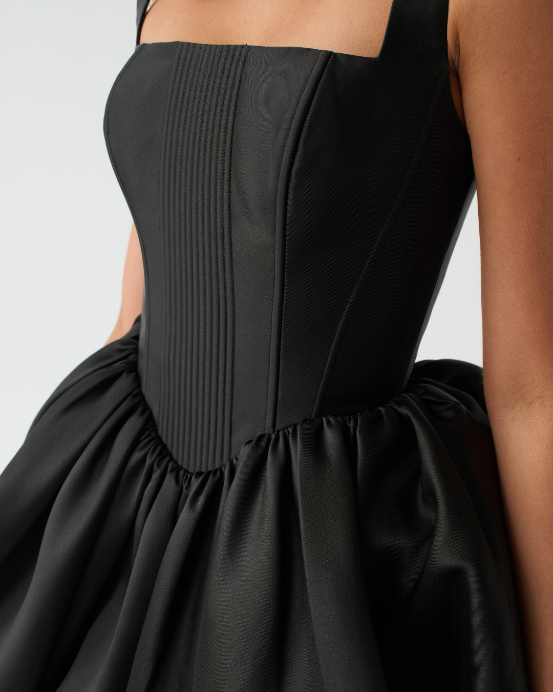 With it’s mirrored corset bodice, Bambi combines our signature classic square neckline with a modern bubble skirt, perfect for the bride ready to dance the night away. Ultra-luxe boning detailing leads into a v-shaped basque waistline to draw the eye and elongate the figure. Add the detachable bows to Bambi’s straps to elevate your look and create the perfect showstopper.