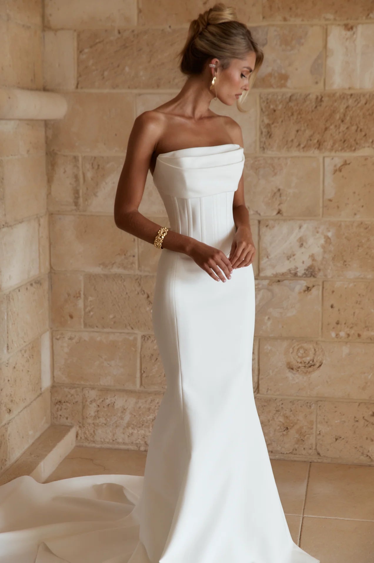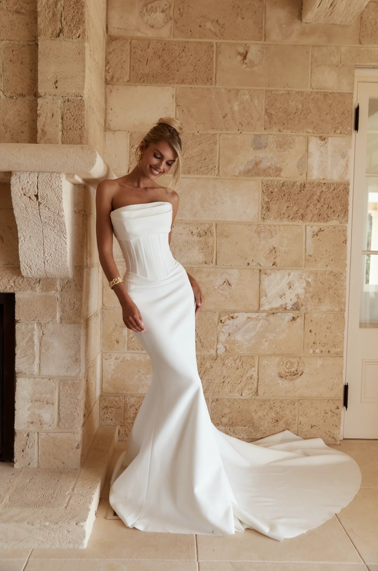 Sculpted for the modern bride, Benni features our signature fit-and-flare silhouette with a slight drop waist and a flattering straight neckline with bust detailing. This structured gown elongates the body while highlighting the waistline and is constructed in a thick body-flattering crepe.