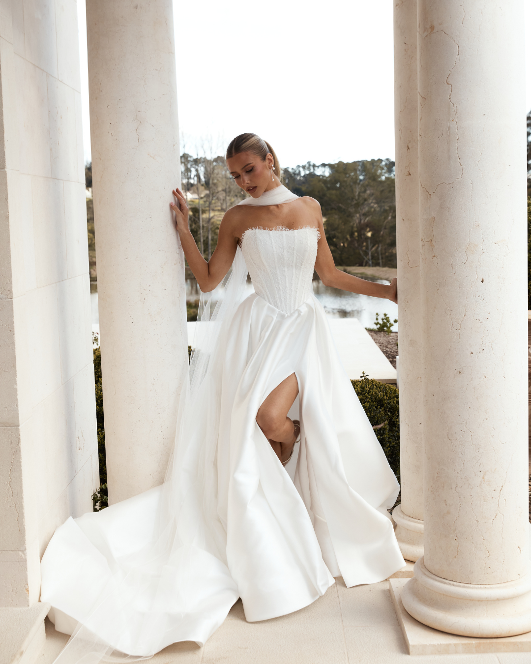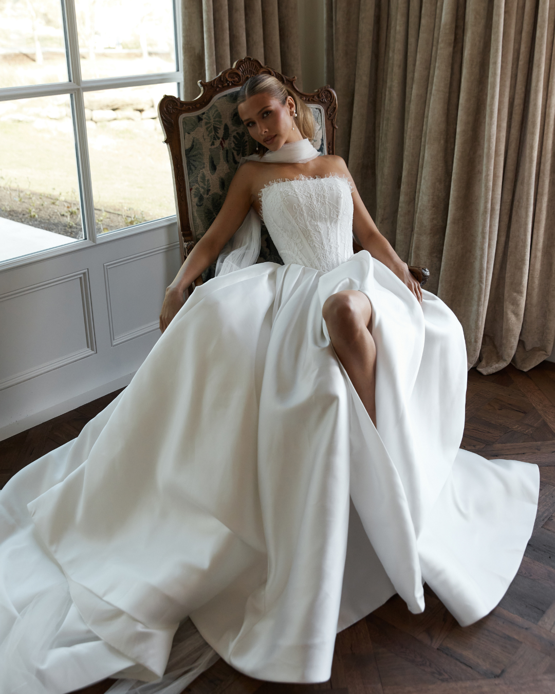 Clementine is a refined, romantic gown that balances structure with softness. The bodice is crafted in our signature lace, featuring a visible basque waistline that curves into true waist seams at the sides to enhance and elongate the figure. A full skirt in lustrous mikado creates volume and movement, while an invisible zip with pearl button and loop closure adds a polished, feminine finish. Timeless and modern all at once, Clementine is made for the bride who wants classic couture lines with a subtle point of difference.