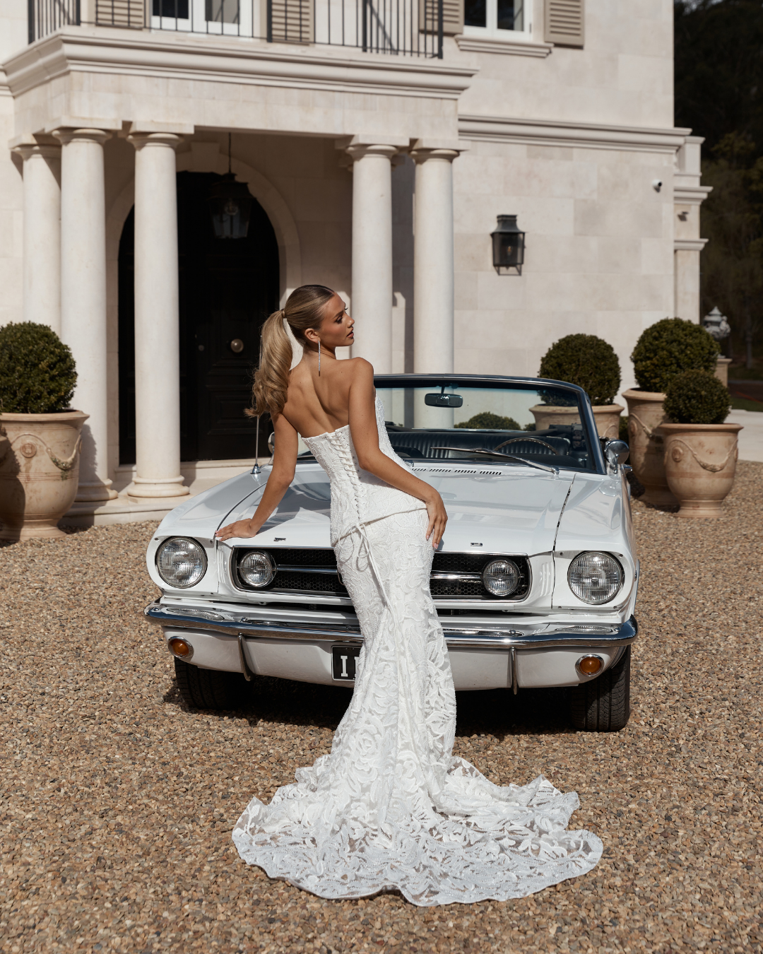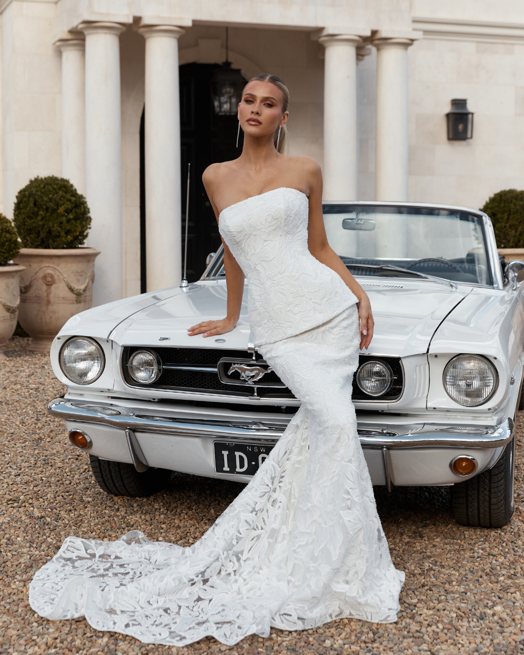 A statement two-piece designed for the bride rewriting the rules. The Dion Set features a fully beaded, strapless corset top with a sculpted fit and lace-up back for a custom, cinched silhouette. Paired with a matching fitted skirt in our signature embroidered lace, this look balances structure with fluidity. Clean lines, dimensional texture and a dramatic train create a modern yet timeless moment.