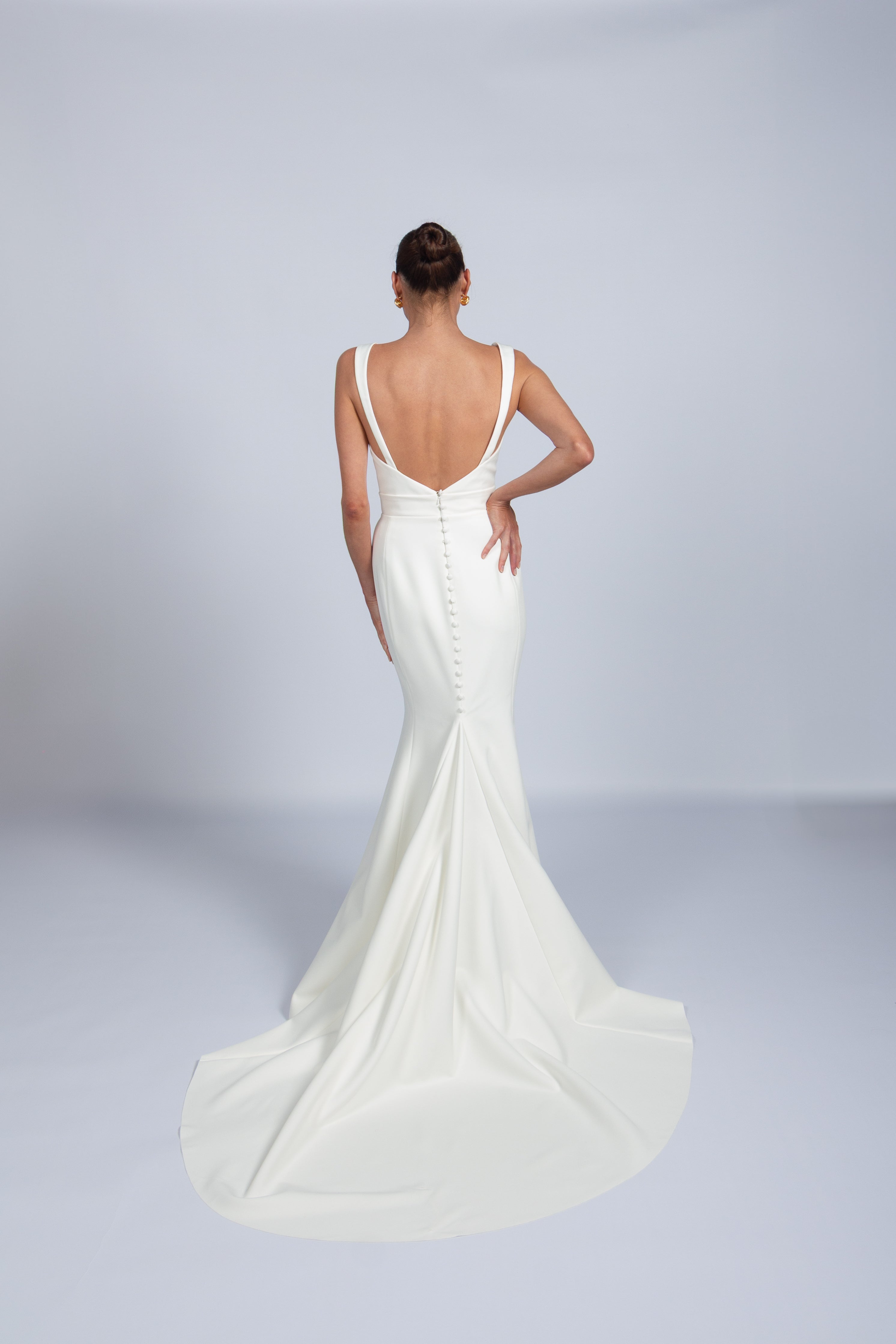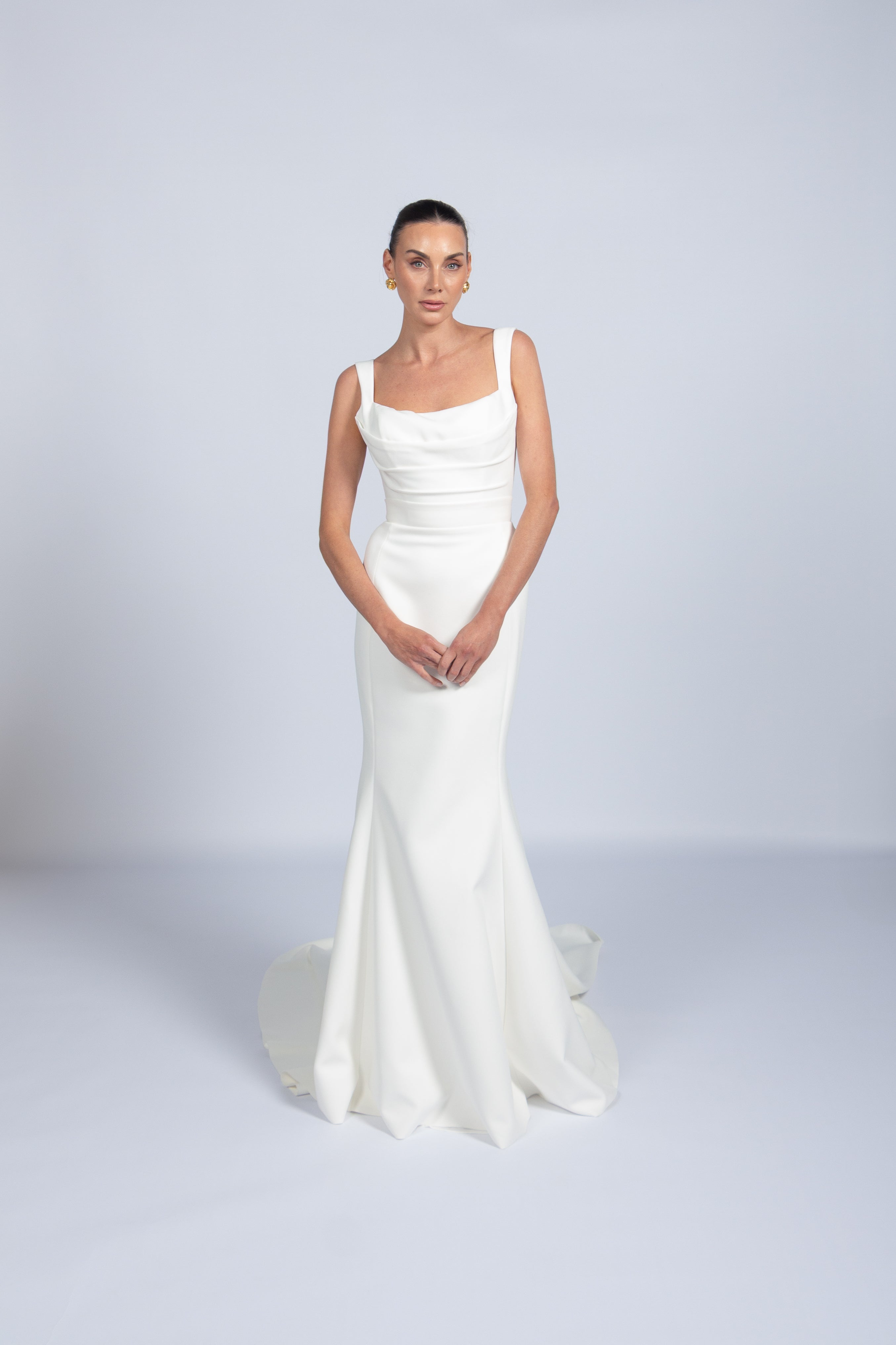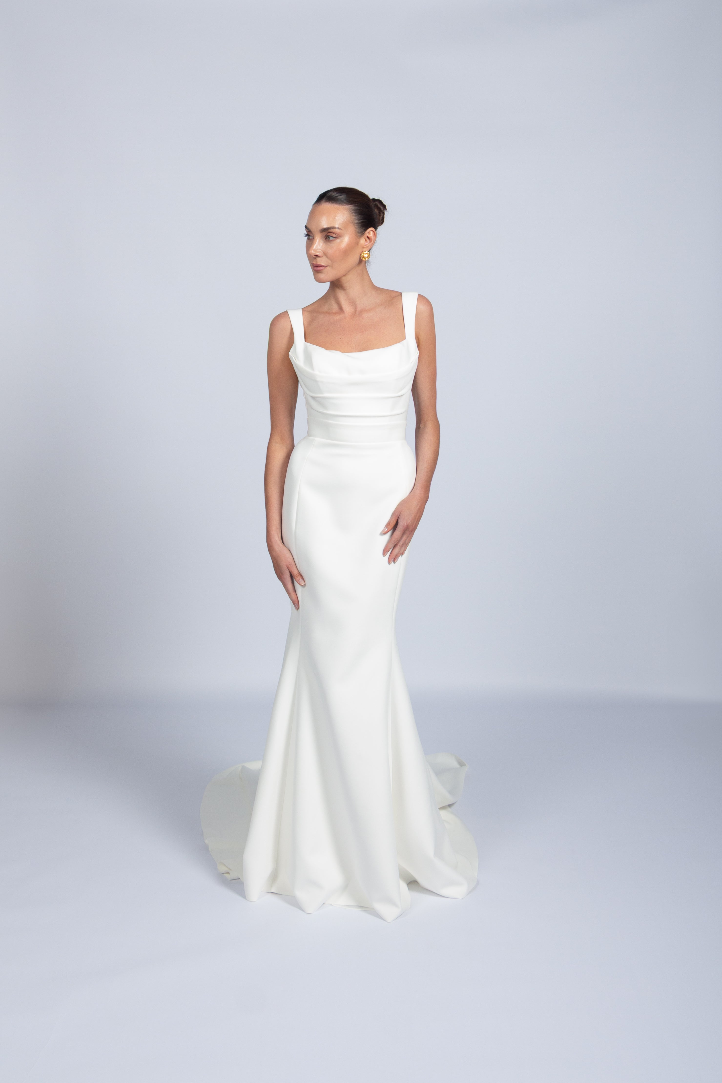 A Melbourne Exclusive style, meet Dion. With our classic figure hugging skirt that flares into a stunning train, covered buttons and a simple pleated bodice for a classic, elegant look on your special day.