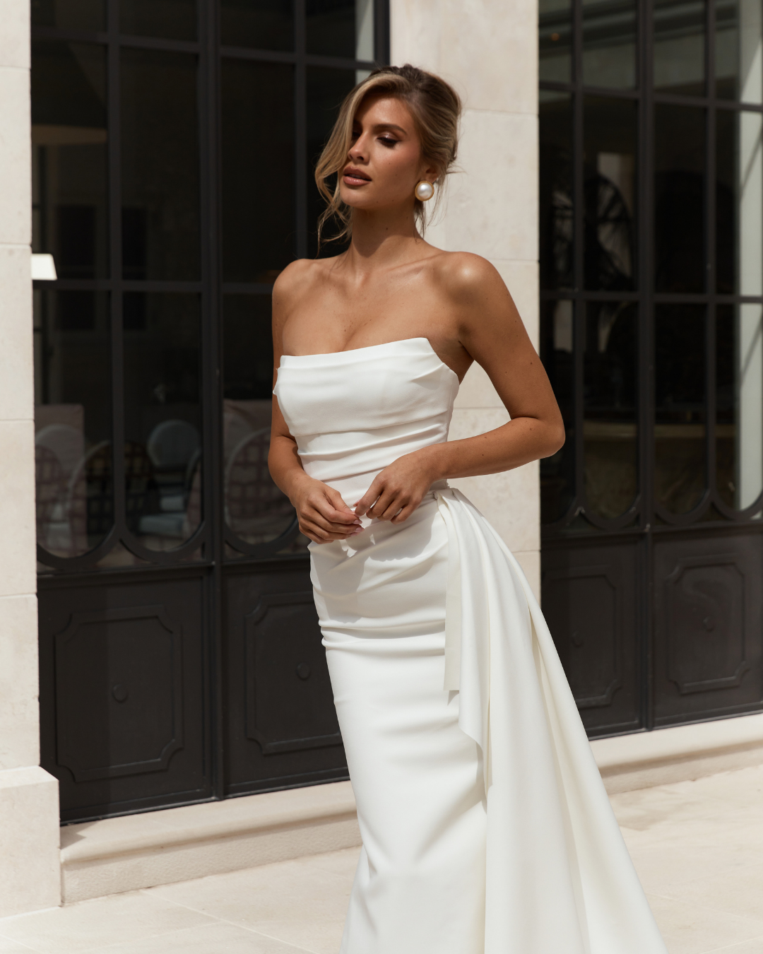 Elegant and effortlessly modern, Eastwood features a clean straight neckline and a beautifully fitted silhouette that skims the body with simplicity. Soft ruching through the bodice adds subtle texture and shape, creating a flattering, sculpted finish. A detachable side train offers two looks in one, sleek and minimal, or elevated with dramatic movement.