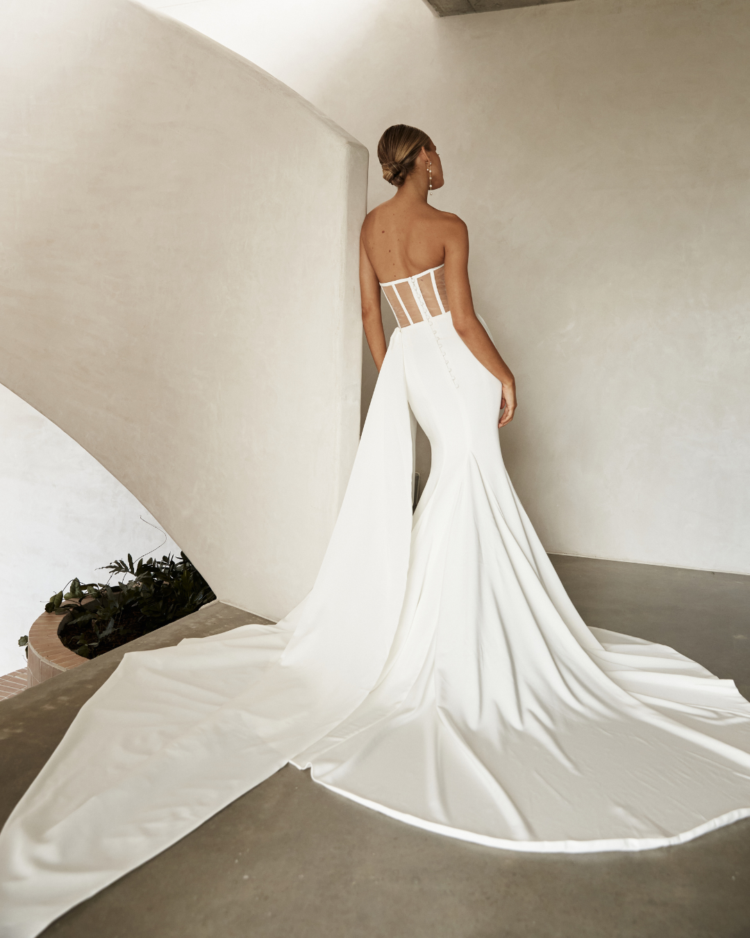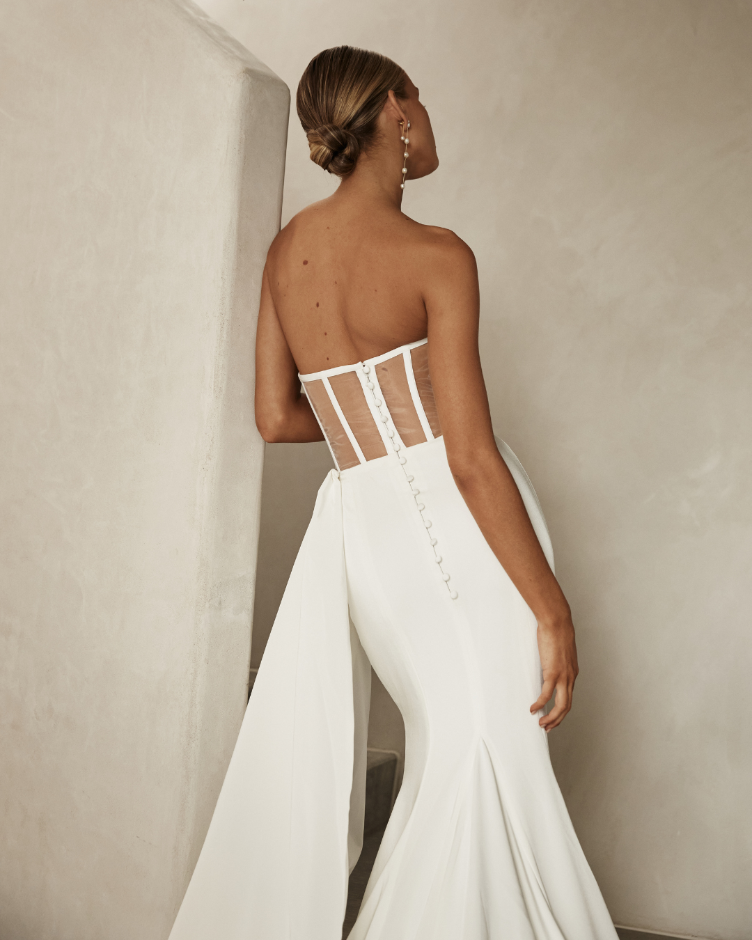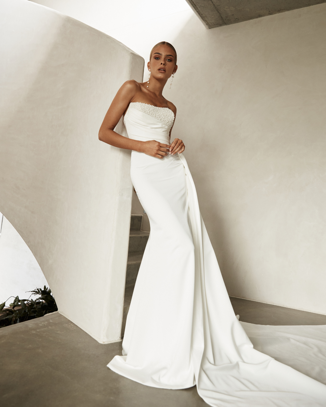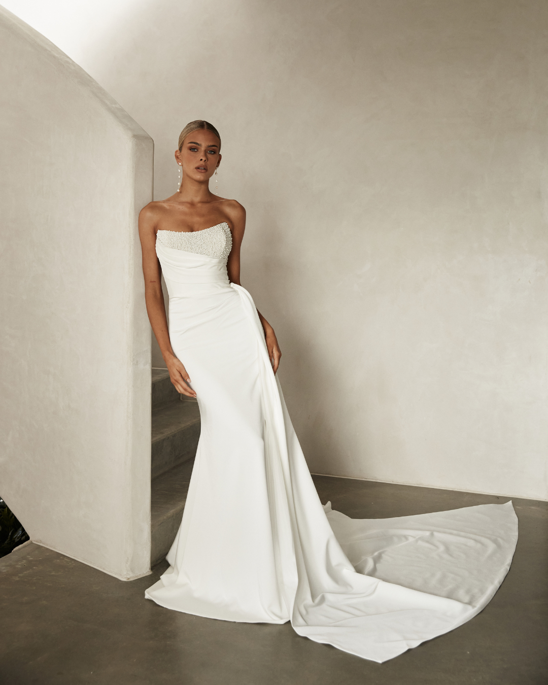 Have the best of both worlds with the Ford gown! Stunning intricate pearl beading is complemented by refined pleated detailing throughout the bodice, creating a secure and structured fit. The fitted skirt is balanced with the detachable side skirt which adds a touch of drama and sophistication to the design. The contemporary brides dream!