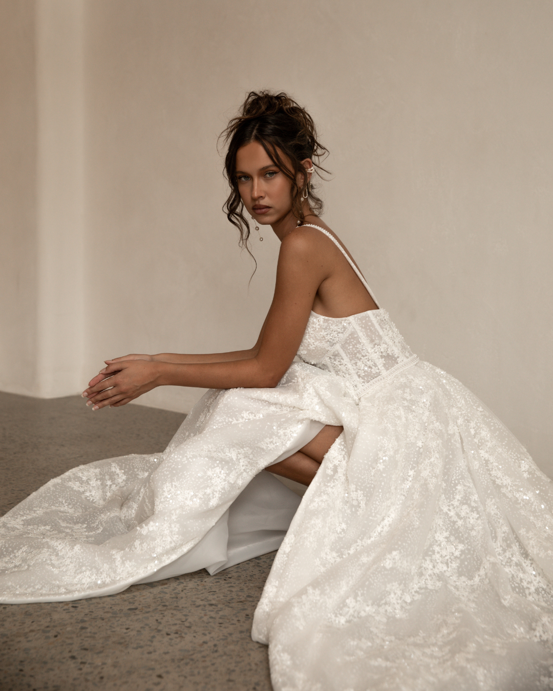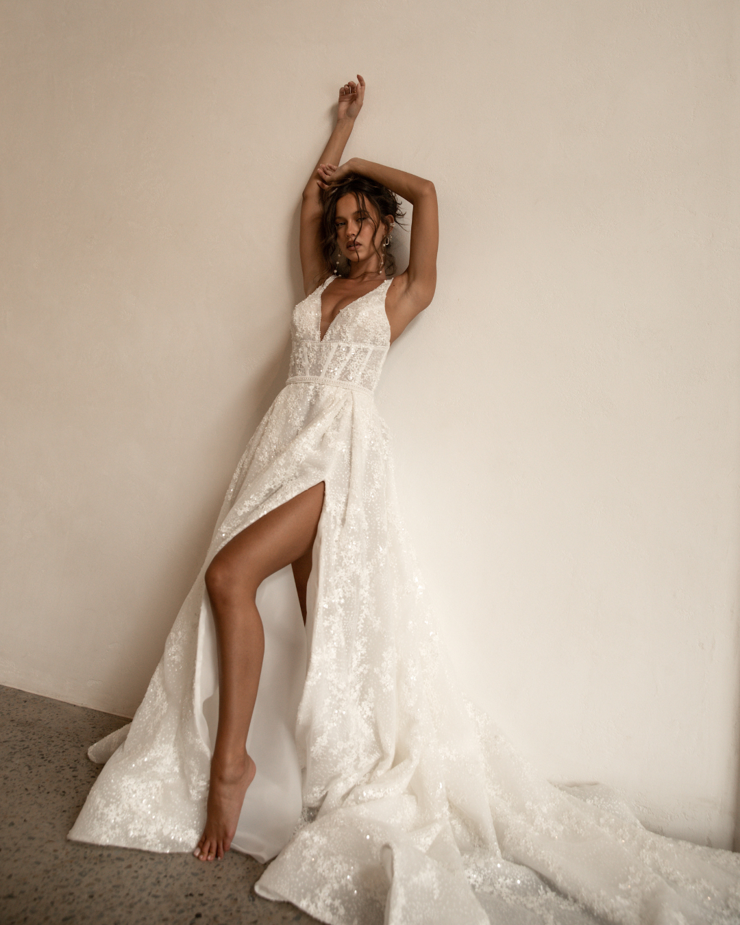 Traditional meets modern with the Haven gown! The tapered v-neckline features beaded trim and corset details adorn this sheer bodice. The full a-line skirt adds a touch of classic sophistication and is paired with a split allowing for beautiful movement.