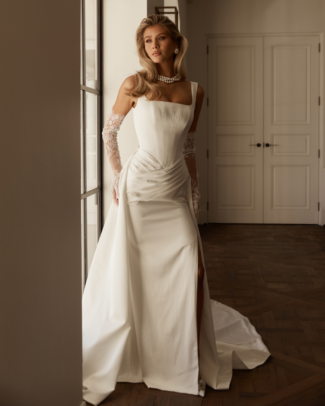 A beautifully structured silhouette with understated drama, Livingston combines modern lines with soft, feminine detailing. The square neckline and straps offer clean, timeless framing, while the sculpted basque waist creates a refined, cinched shape. Gentle ruching sweeps across the lower bodice, adding texture that flatters and elongates the figure. Finished with a sleek leg split and pearl button detailing at the back, Livingston is minimal, elegant and effortlessly striking.