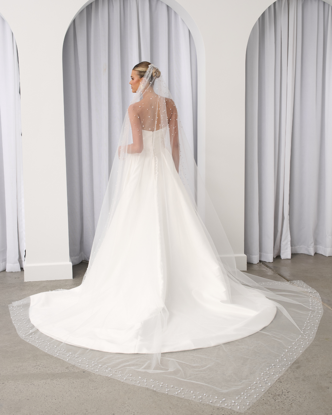 A new take on the modern classic, reimagined for the statement bride who still wants focus on the gown. This veil is delicately scattered with soft pearls along the trim, creating a soft shimmer as you walk.