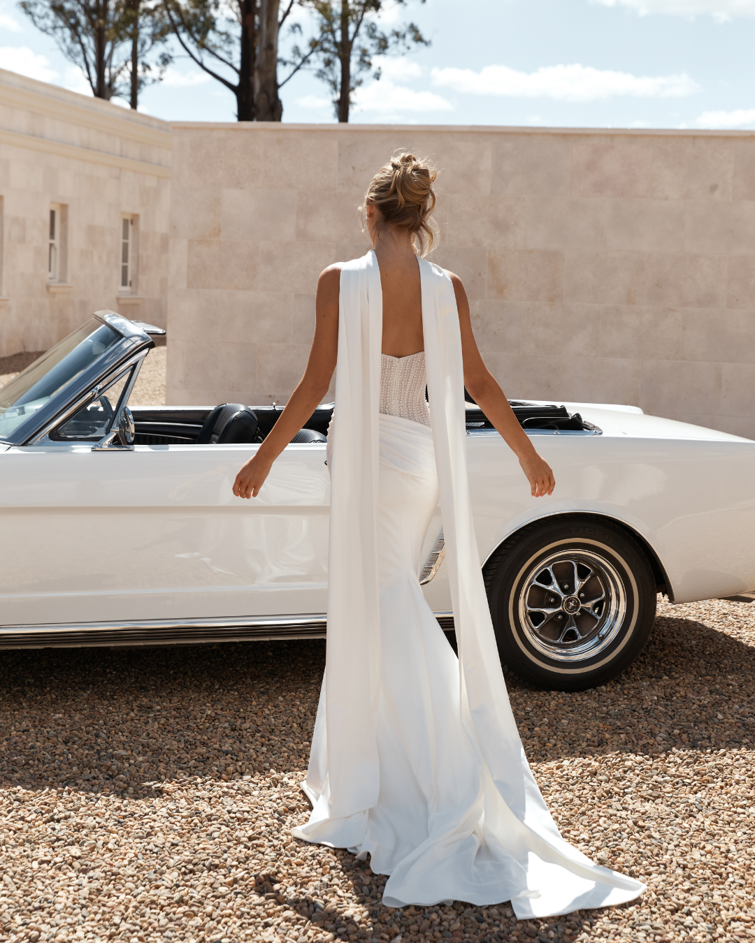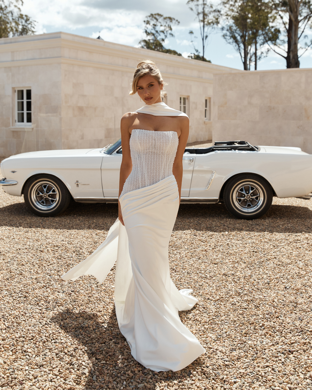 A modern statement of texture and shine, Porter blends intricate beading with sleek lustre satin for a truly unique finish. The straight neckline and fitted silhouette highlight the structured bodice, revealing subtle exposed boning beneath the beading for a couture-inspired edge. Soft ruching sweeps diagonally across the waistline, creating shape and movement while balancing the gown’s clean, minimal lines.
