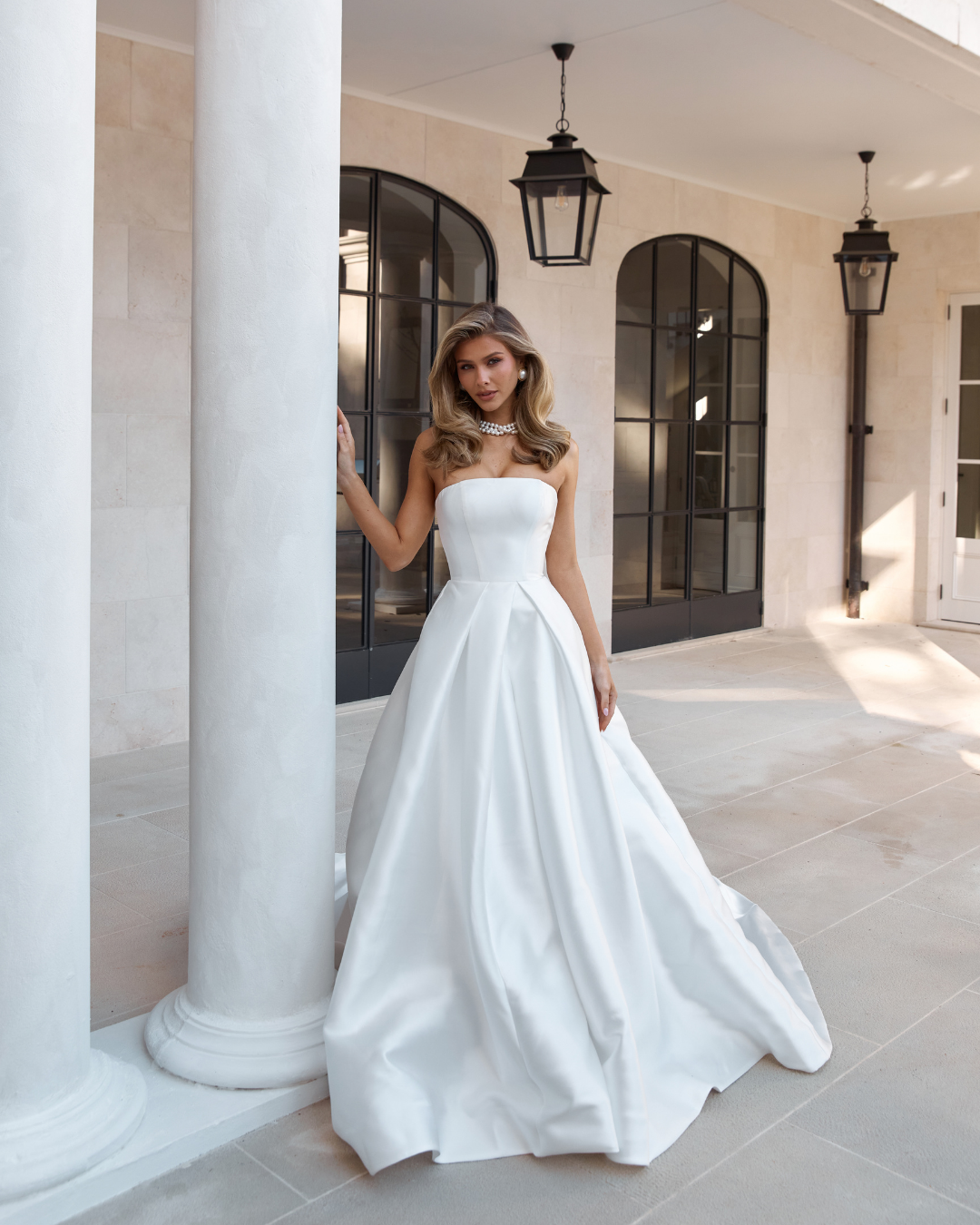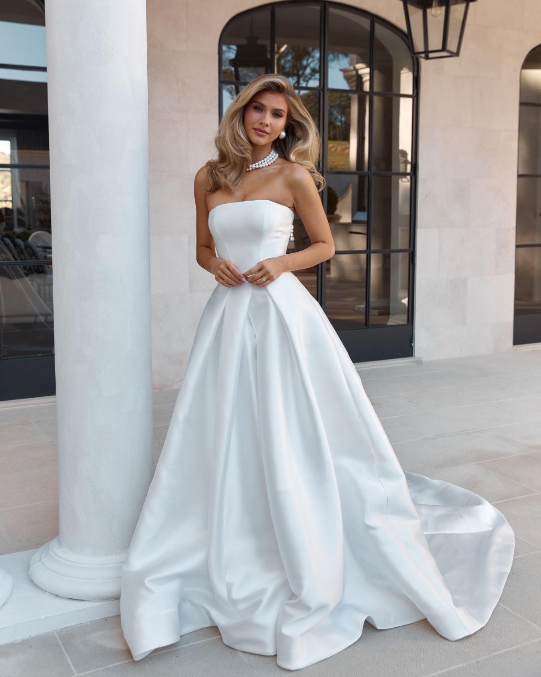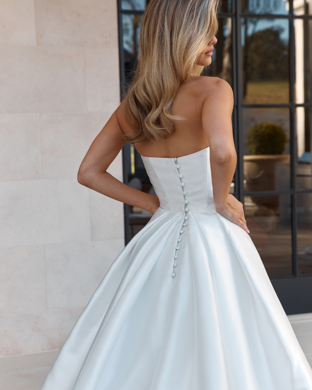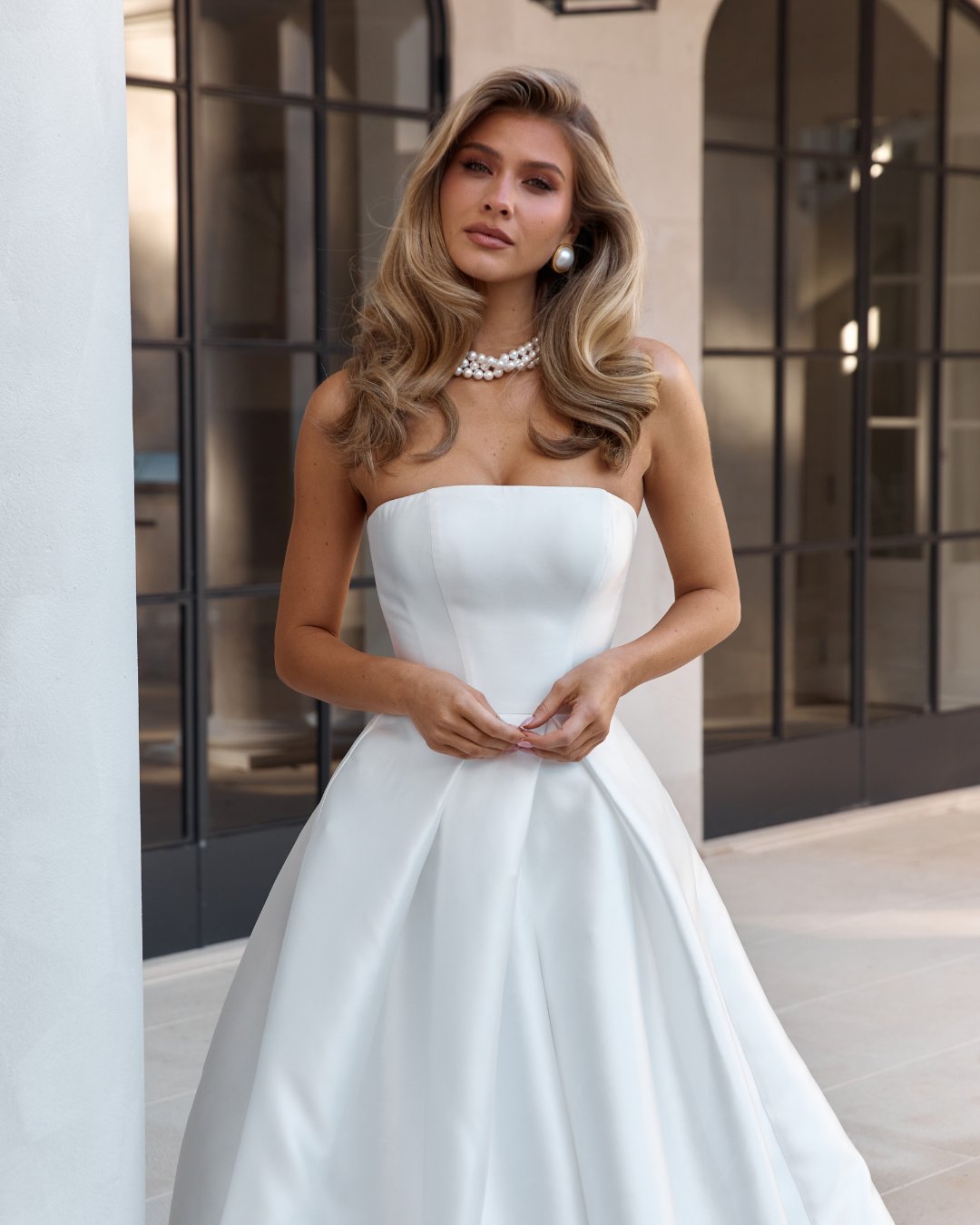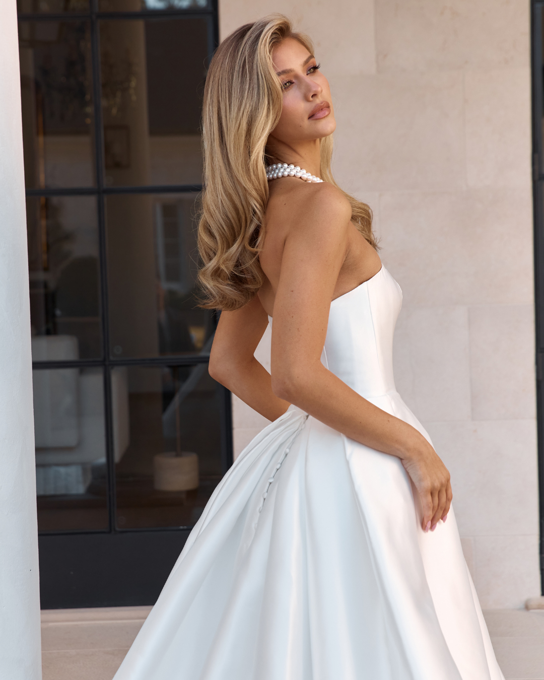 Inspired by an original 1990’s Jane Hill pattern, the Rose gown is a love letter to the brand’s legacy, reimagined for the modern bride. Crafted in our signature luxe mikado, Rose showcases a beautifully structured strapless bodice paired with the iconic Jane Hill A-line skirt, creating an effortlessly sculpted silhouette that feels both nostalgic and undeniably contemporary.