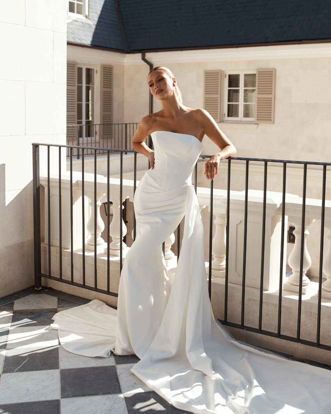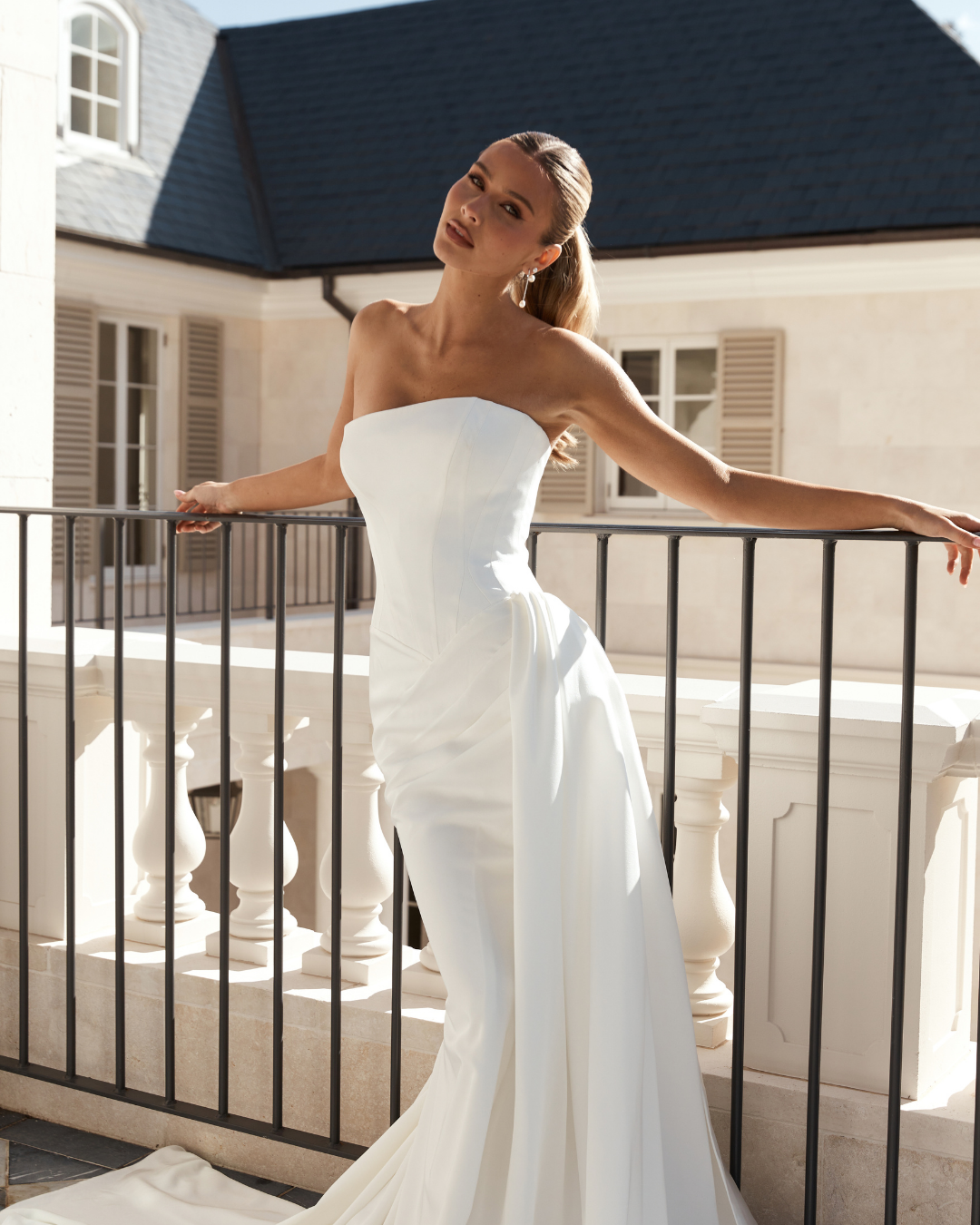 Modern, sculpted and effortlessly refined, Slate is a contemporary take on classic corsetry. The straight neckline and exposed seam detailing highlight the structured bodice, flowing into a basque waist that shapes and elongates the figure. Soft ruching sweeps across the hip for a flattering finish, while the detachable side train adds optional drama. A lace-up corset back completes the look with timeless bridal allure.