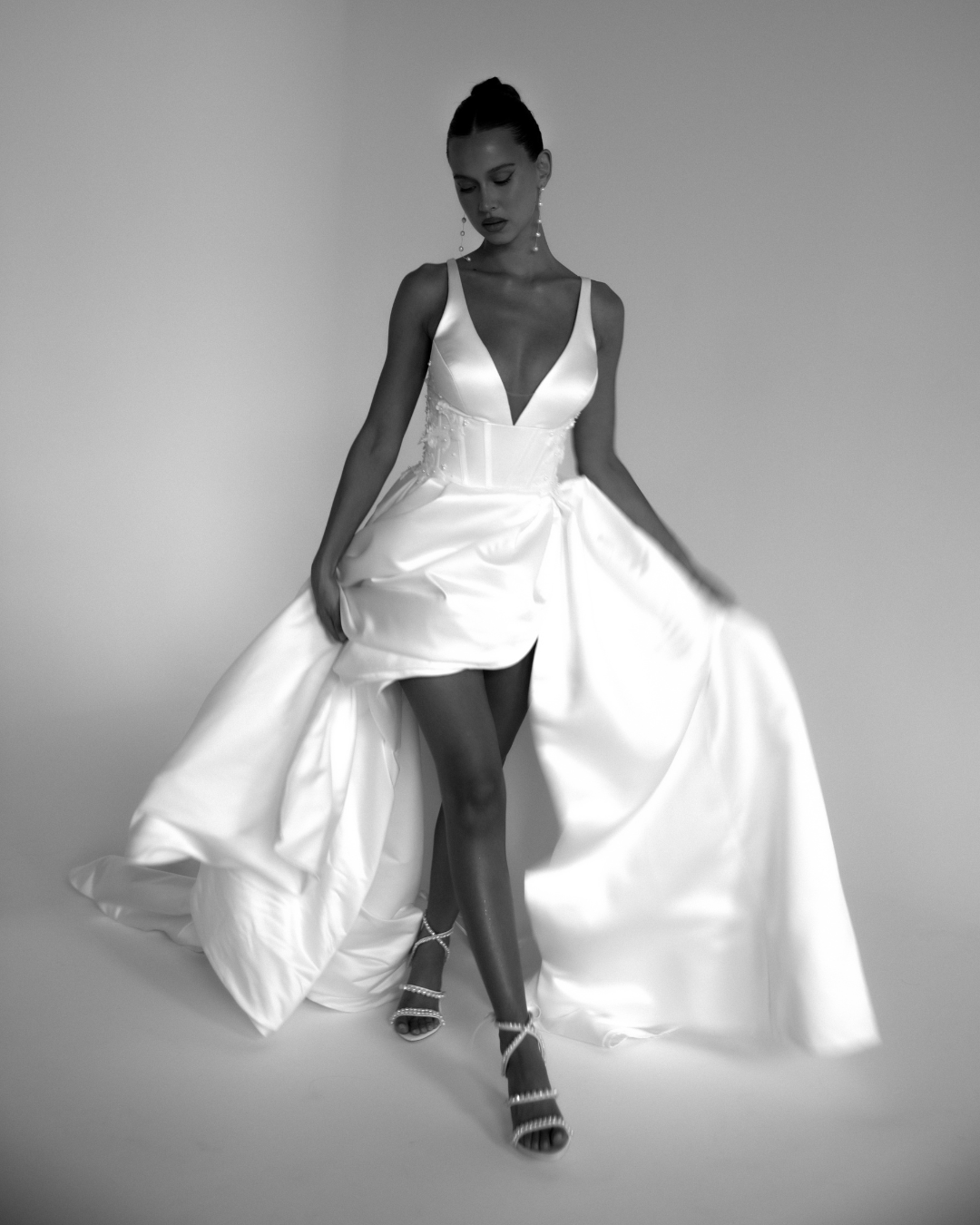 A unique take on the traditional, Steele features a deep-v neckline and 3D lace applique on the bodice paired with a full A-line shaped skirt.