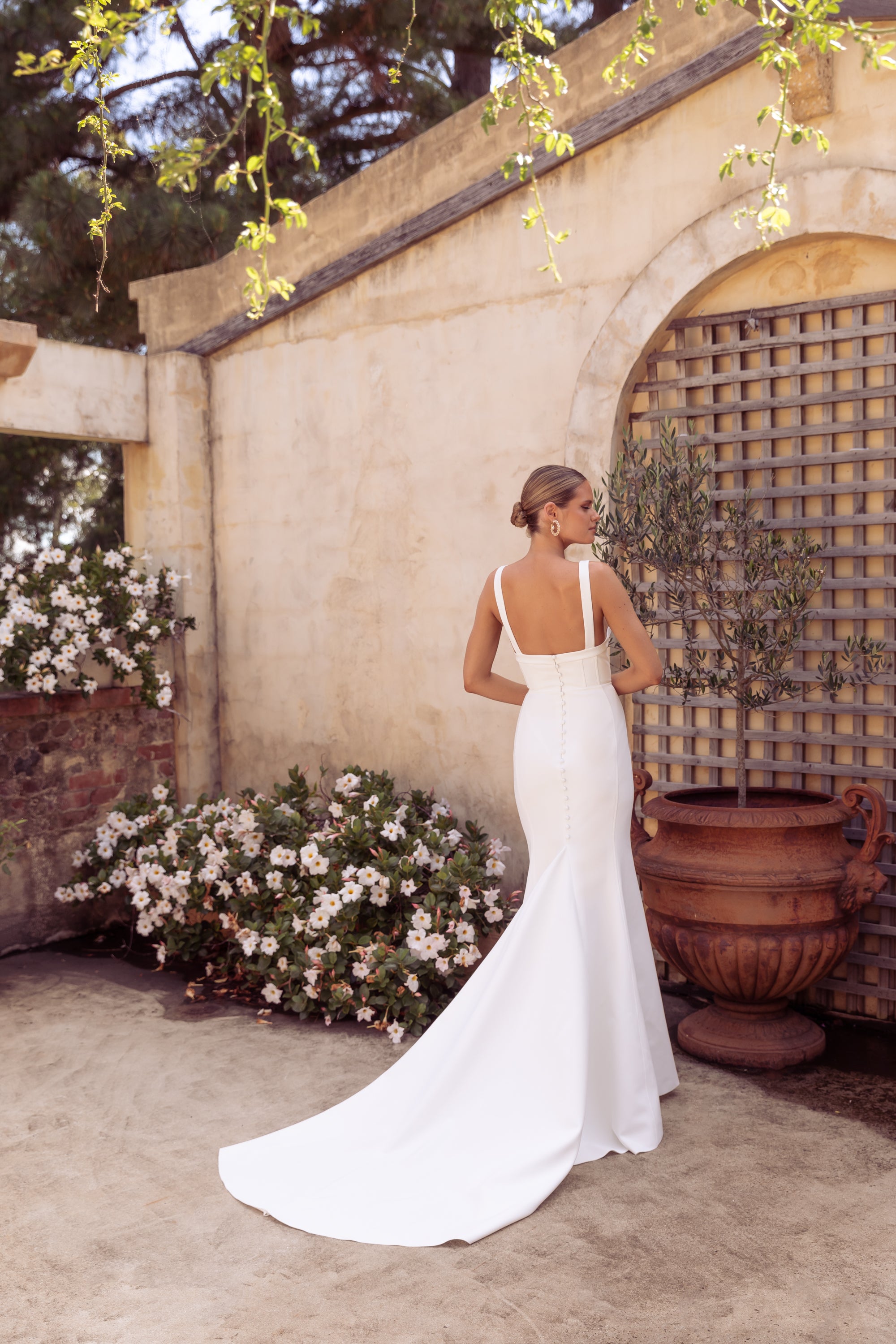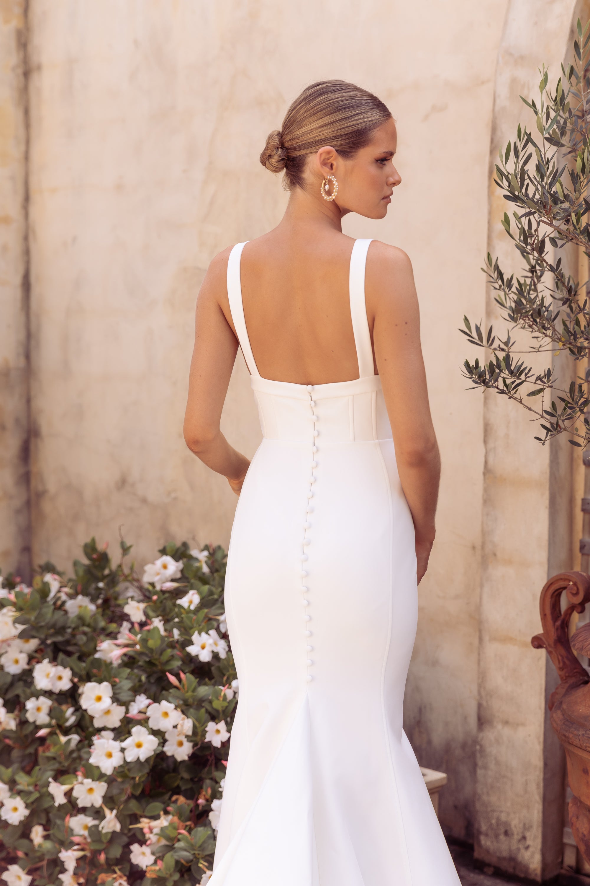 With a simple silhouette the Tommie gown is perfect for the modern bride! A square neckline features thick straps for a supportive fit and a wide basque on the waist, providing a beautiful fit and comfort. Corset details adorn the bodice and covered buttons lead down to the godet and dramatic train. Perfect for the bride looking for a simple dress with a point of interest.