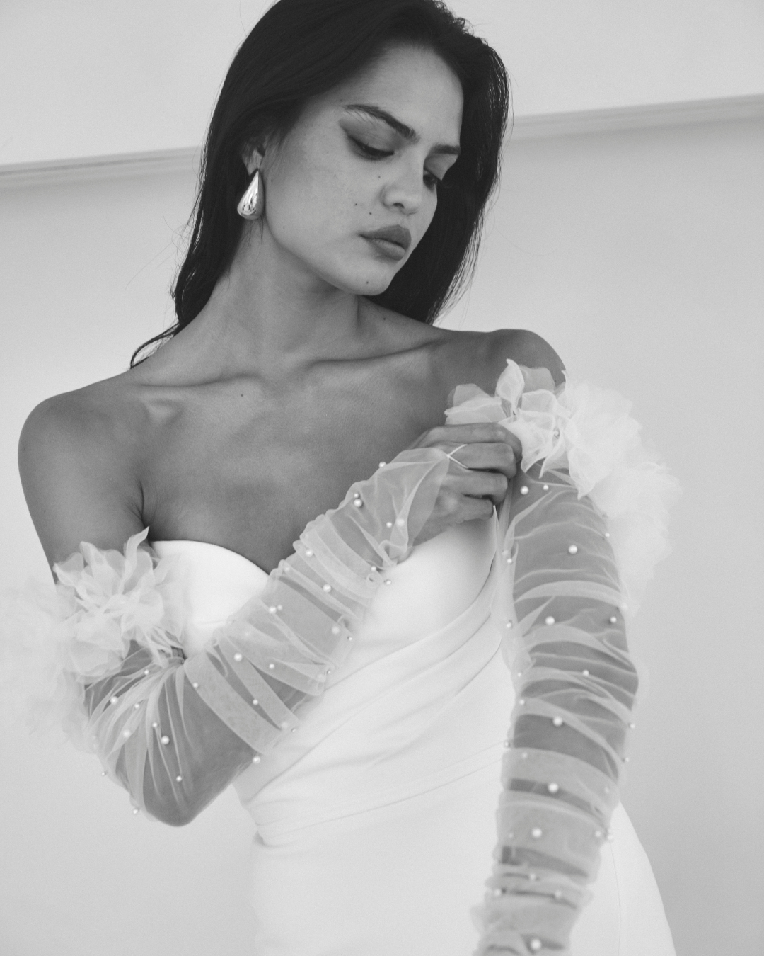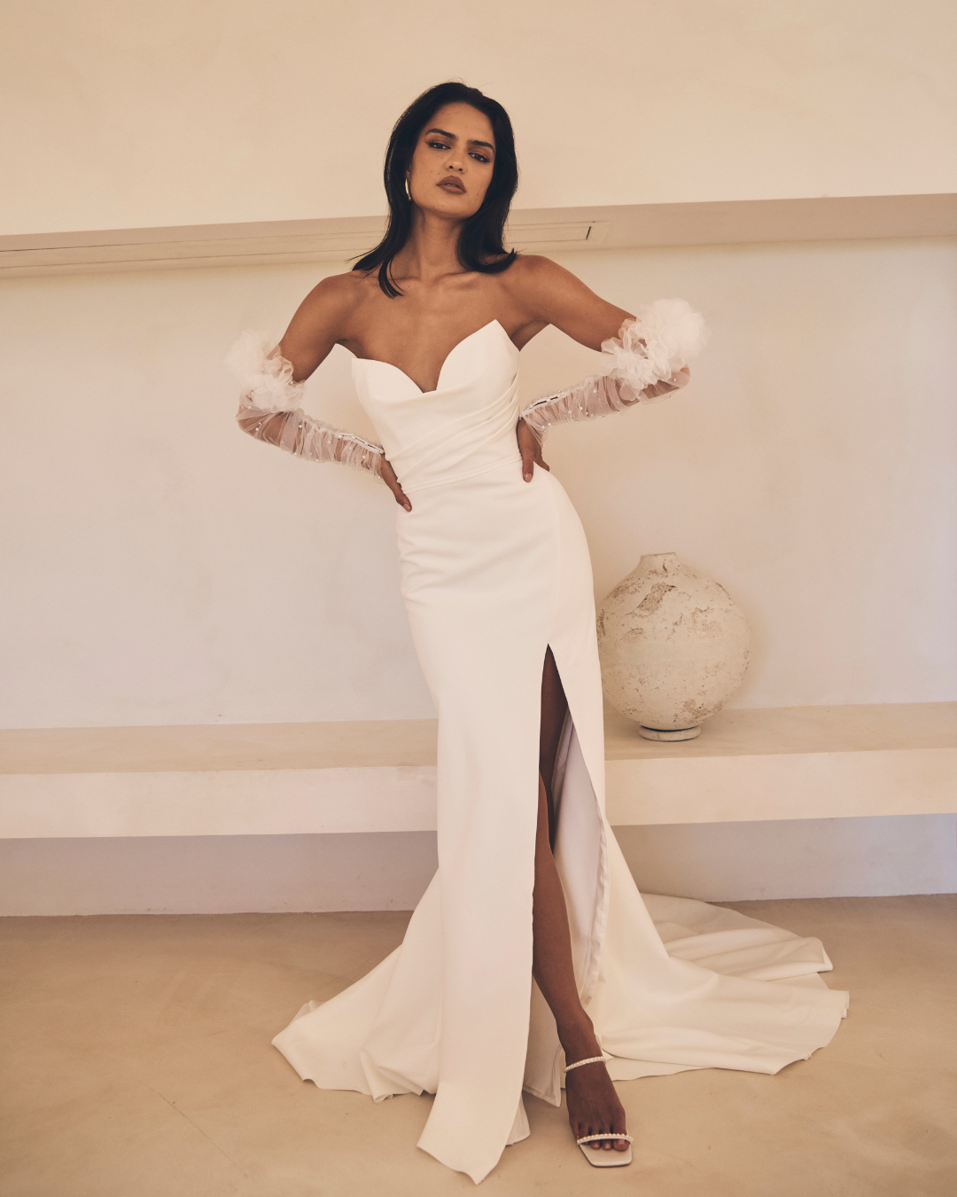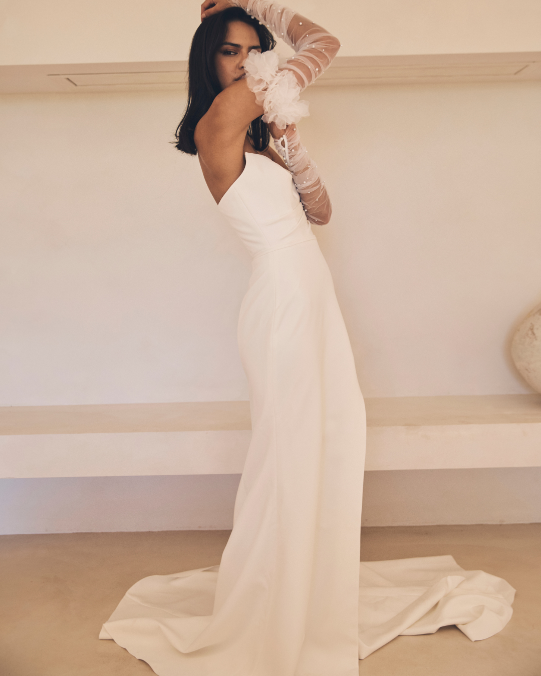 The Valley Gown embodies modern elegance with its sleek design and contemporary details, the simplistic design is perfect for accessorising with our signature JH gloves or your favourite earrings, perfect for the fashion forward bride who wants to make the gown her own.