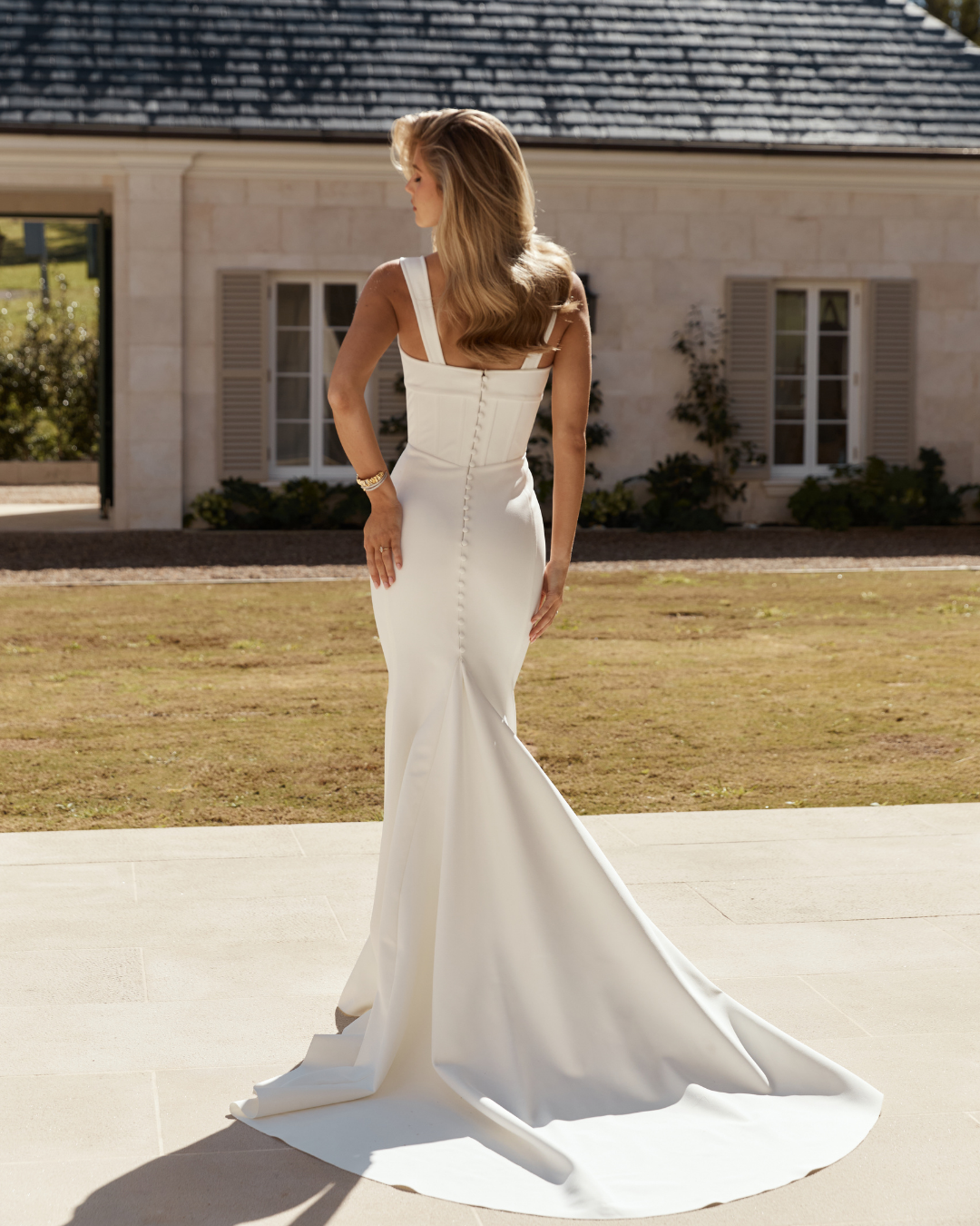 An evolution of our beloved Benni gown, Weston introduces sleek straps and a refined square neckline for added structure and support. The signature corseted bodice remains, sculpting the waist with clean panel lines and a smooth, elongated silhouette. Crafted in bonded crepe, Weston is minimal, contemporary and effortlessly flattering from every angle. Finished with a subtle train, this gown blends simplicity with unmistakable Jane Hill craftsmanship.