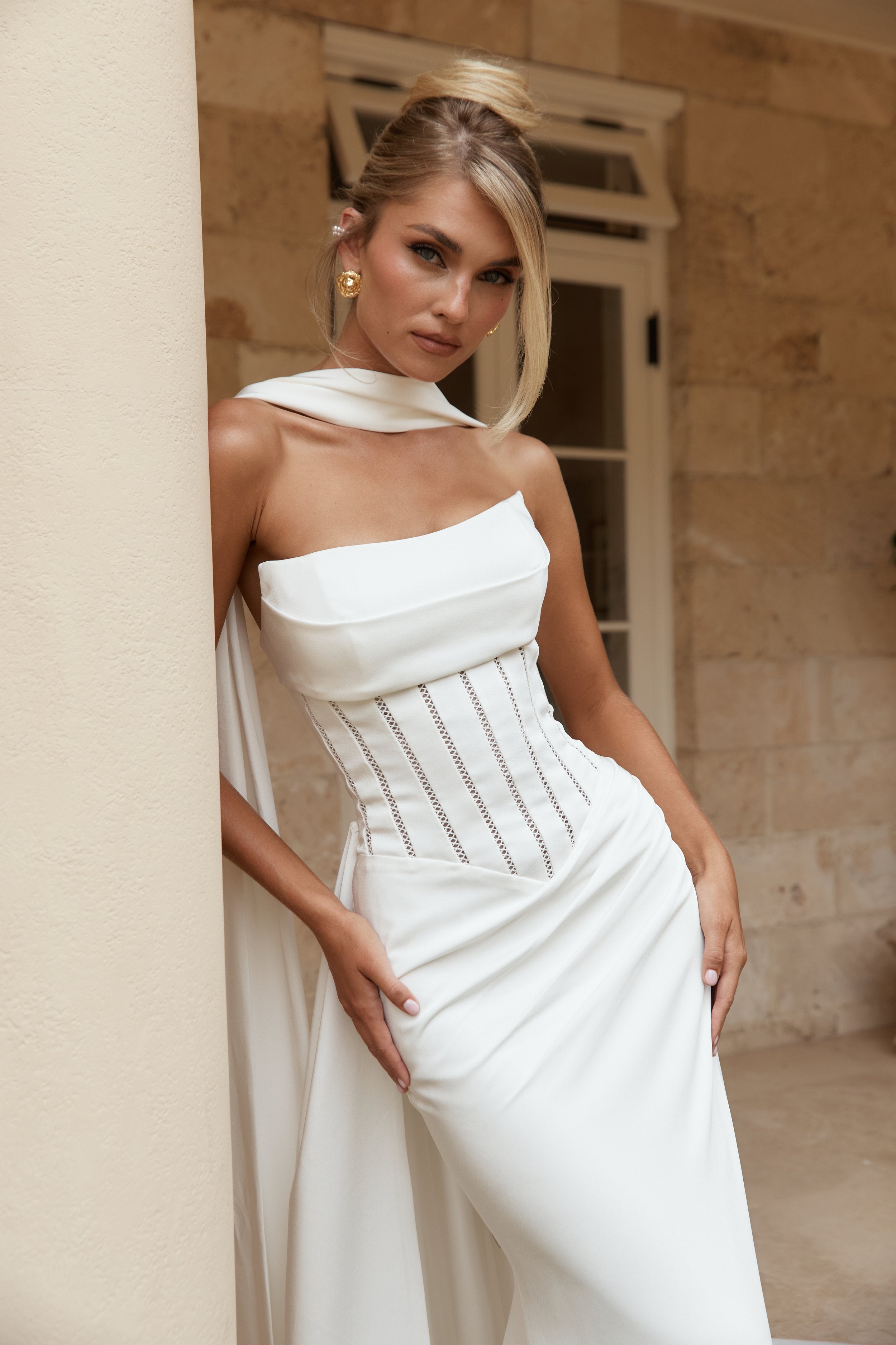Chic and editorial, Westwood blends sheer corsetry with sculptural pleating. The basque waist corset and strapless neckline sculpt the torso, while pleated hip detailing adds a modern edge. The signature thigh-high split can be customised.